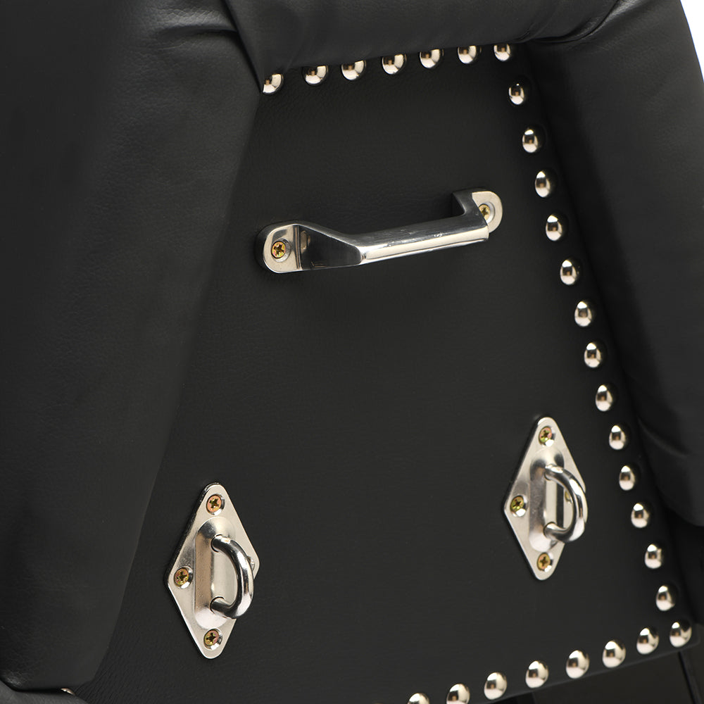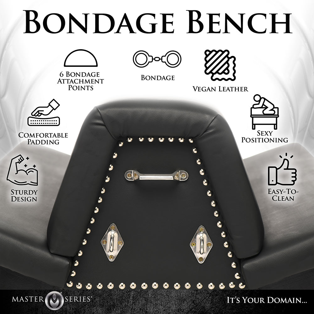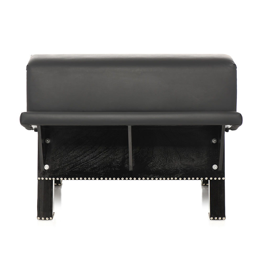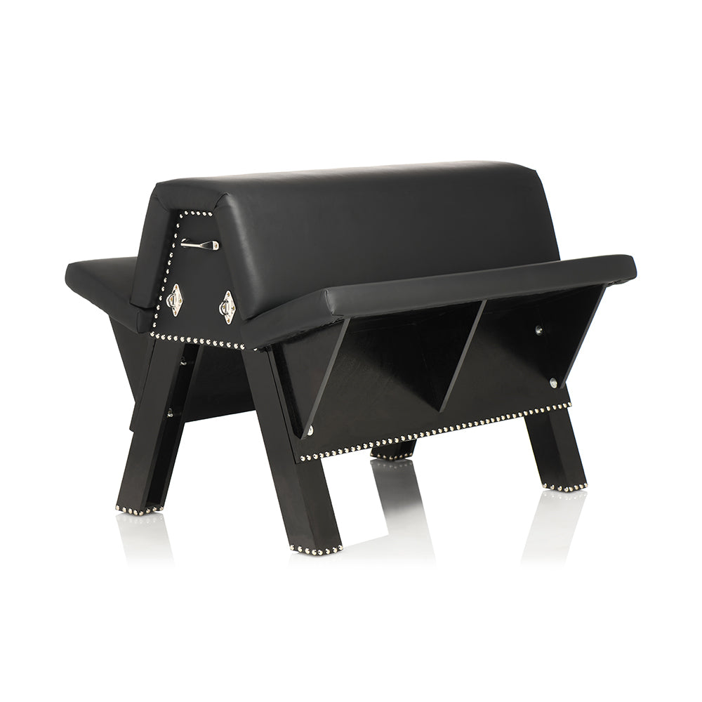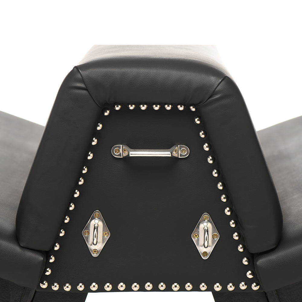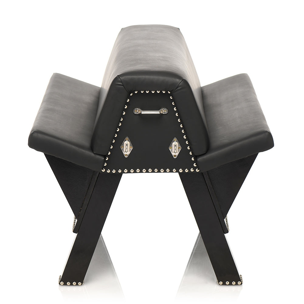 Transform your space by adding a classic bondage bench as the centerpiece of your pleasure. The classic design and smooth black vegan friendly leather with bold metal accents stand out and invite you to give in to your darker desires. The smooth faux leather feels divine against bare skin as you indulge in devious play with your partner! Restrain them to the bench with cuffs that attach to any of the 6 attachment points. Tease and torment your submissive to your heart's delight by introducing different impact toys and play! This sturdy wood and metal bench can handle up to 660 lbs. so you both can hop on and enjoy each other. The padded cushions make it comfortable for you both to kneel straddle or sit for sexy scenes! After play simply wipe it clean until next time. All metal is nickel-free for sensitive skin.