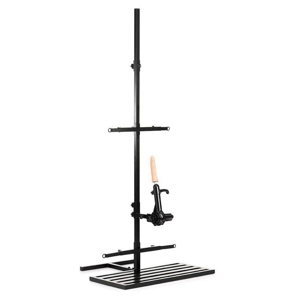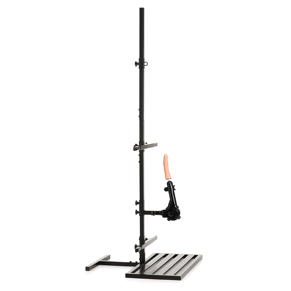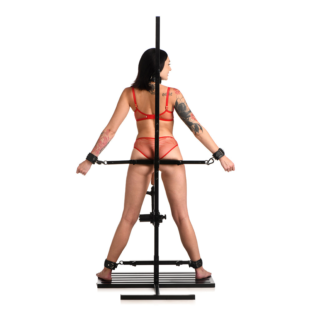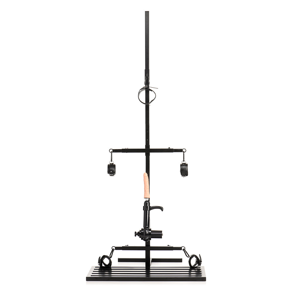 Have your submissive partner stand and take it or lock yourself in for a seriously unique and intense pounding! This Ultimate Enforcer Orgasm Tower comes with a removable sex machine and provides the full package for dungeon torment and pleasure! This full set includes 1 tower 1 sex machine 2 premium silicone dildos 1 collar 2 wrist cuffs 2 ankle cuffs 5 carabiners 1 fixed base with dildo adapter 1 adjustable base with dildo adapter 1 D-ring adapter. Made out of sturdy strong steel the tower is easy to put together and has adjustable height and width! Adjust the width of the ankle or wrist bars the height of the collar and the height of the sex machine so you can enjoy custom sizing for anyone who is locked up! On the tower are 5 D-ring attachment points. Use the wrist cuffs on either side of the wrist bar to keep their hands and arms from moving. Use the ankle cuffs provided to spread their legs no matter how hard they get pounded. Attach their collar to the center attachment point to keep them from moving their head and neck. Once they're all strapped in enjoy the powerful thrusting of the sex machine and tease and torment them as they're restrained! Have some fun and use both dongs on them at once! When you connect both of the base adapters you can try out double penetration!