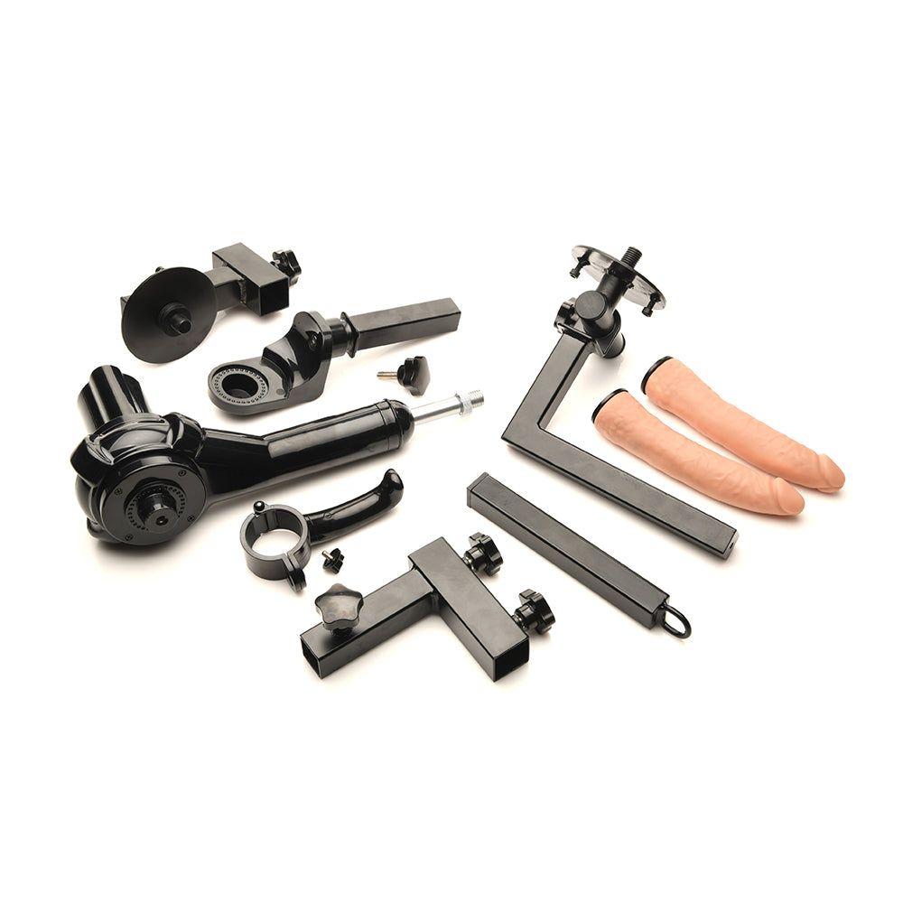 - Dungeon Ready: Includes 1 tower 1 sex machine 2 premium silicone dildos 1 collar 2 wrist cuffs 2 ankle cuffs 5 carabiners 1 fixed base with dildo adapter 1 adjustable base with dildo adapter 1 D-ring adapter.