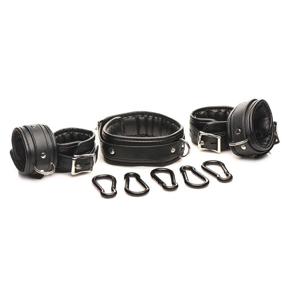 - Restrain Them!: Set includes vegan leather wrist and ankle cuffs and a collar. Attach them to any of the 5 D-rings.