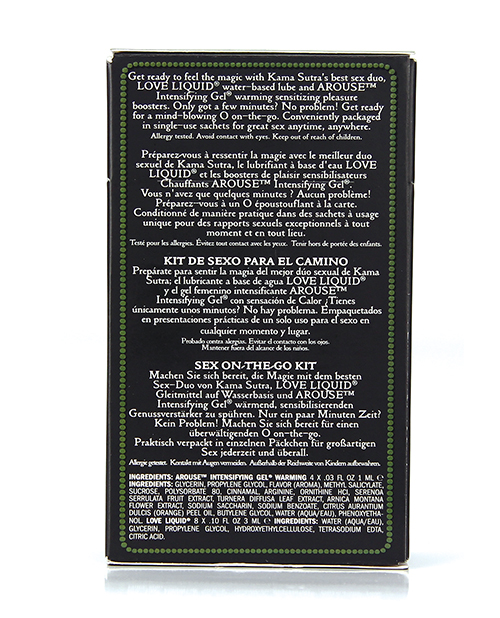 Sex-to-Go Kits from Kama Sutra: Sex Magic Sex to Go Kit. Conveniently sized to fit discreetly into a pocket or purse. Contains an assortment of single-use sachets for a quickie anytime, anywhere. Sex Magic Kit contains: 4 Arouse Intensifying Gel Warming Sachets – Clitoral Sensations Gel. 8 Love Liquid Sachets – water based lube. Multi-Lingual Informational Brochure with tips and sex positions.